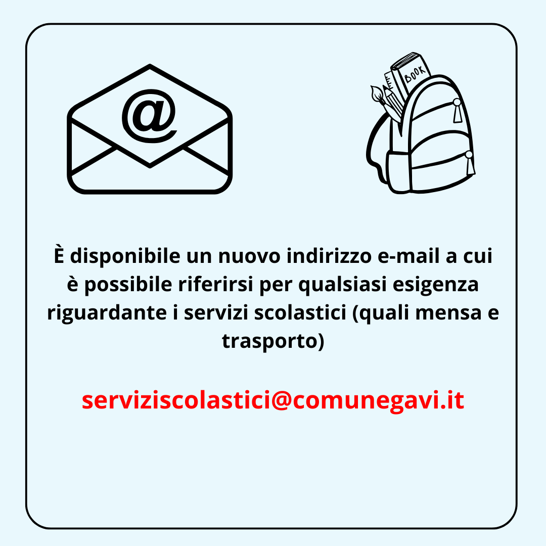 Si avvisa che è disponibile un nuovo indirizzo e-mail a cui è possibile riferirsi per qualsiasi esigenza riguardante i servizi scolastici (quali mensa e trasporto)