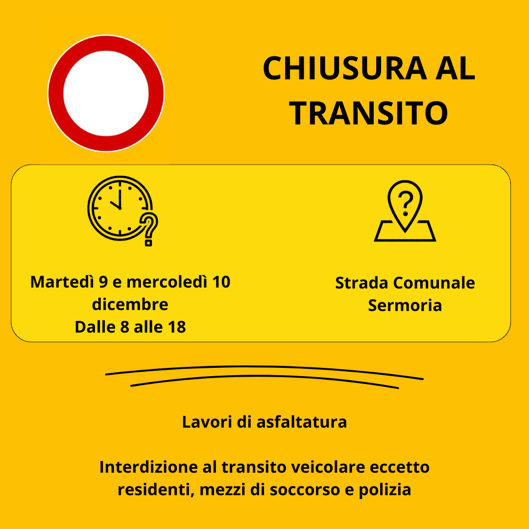 Si avvisa la cittadinanza che per lavori di asfaltatura in Strada Comunale Sermoria, nei giorni di martedì 9 e mercoledì 10 dicembre, dalle ore 8 alle ore 18, vi sarà interdizione al transito veicolare.