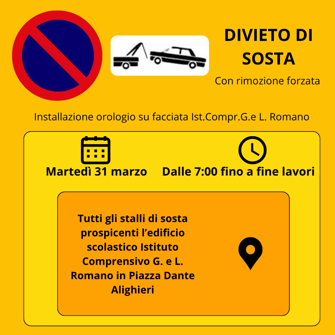 Il Comune di Gavi deve provvedere, martedì 31 marzo 2026, all'installazione di un nuovo orologio sul prospetto dell'Istituto Comprensivo G. e L. Romano in Piazza Dante Alighieri, unitamente a lavori di manutenzione, si stabilisce, per tale data, a partire dalle ore 7:00 sino a fine lavori, il divieto di sosta con rimozione forzata in tutti gli stalli di sosta prospicenti l'edificio scolastico in loco.