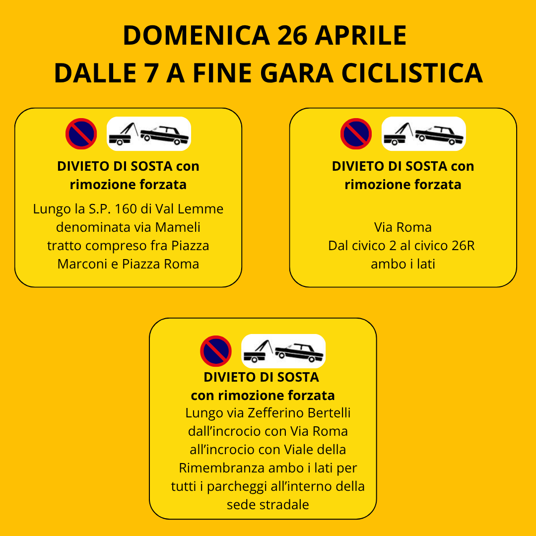 Pertanto, si dispongono le seguenti modifiche alla viabilità per domenica 26 aprile dalle 7:00 sino a fine gara: istituzione del divieto di sosta con rimozione forzata lungo la S.P. 160 di Val Lemme denominata Via Mameli nel tratto compreso fra Piazza Marconi e Piazza Roma