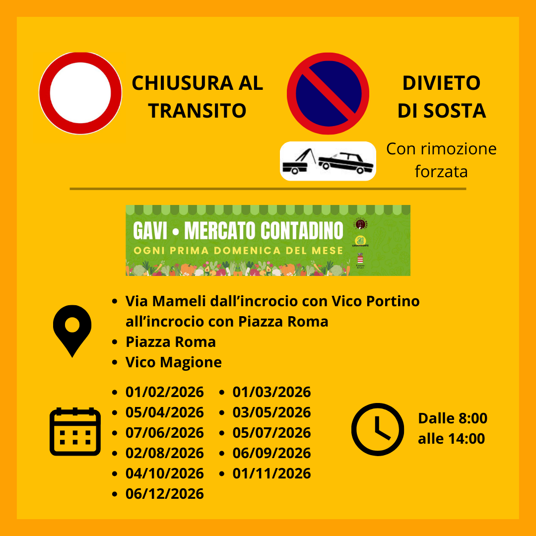 In previsione del Mercato Contadino, organizzato dalla Pro Loco di Gavi tutte le prime domeniche del mese, lungo via Mameli, si stabiliscono la chiusura al transito e l'istituzione del divieto di sosta con rimozione forzata, nelle seguenti modalità: