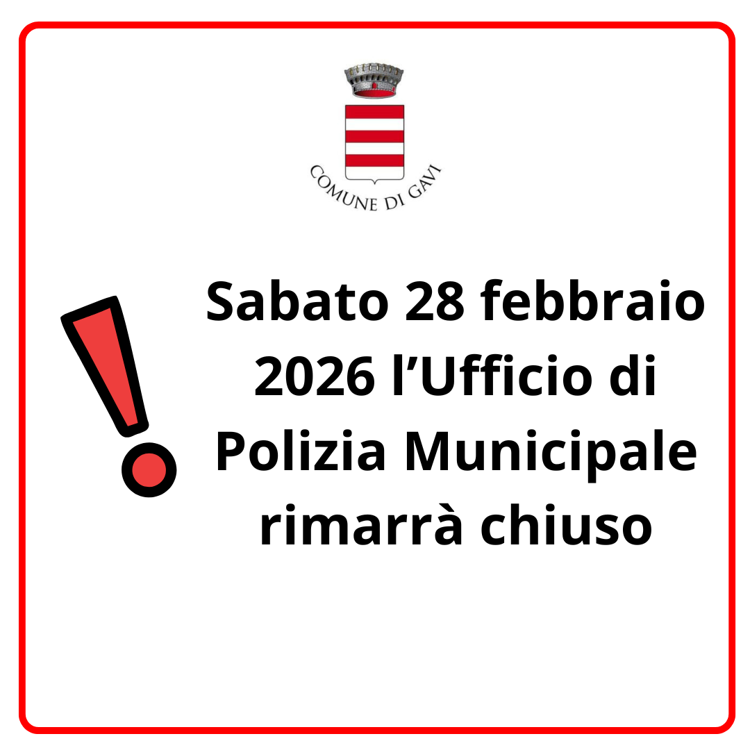 Si avvisa che sabato 28 febbraio 2026 l'Ufficio di Polizia Municipale del Comune rimarrà chiuso.