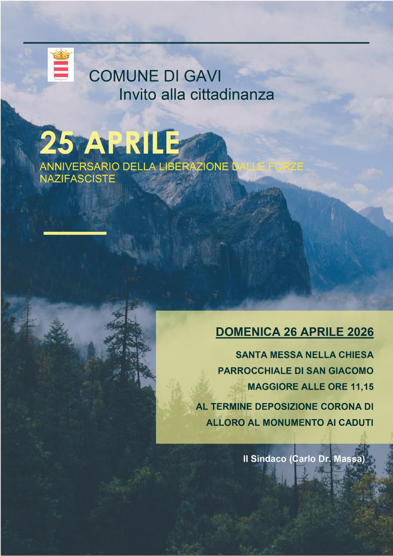 Per commemorare l'anniversario della Liberazione dalle forze nazifasciste, sabato 25 aprile 2026, alle ore 11:15, si terrà una Santa Messa nella Chiesa Parrocchiale di San Giacomo Maggiore.