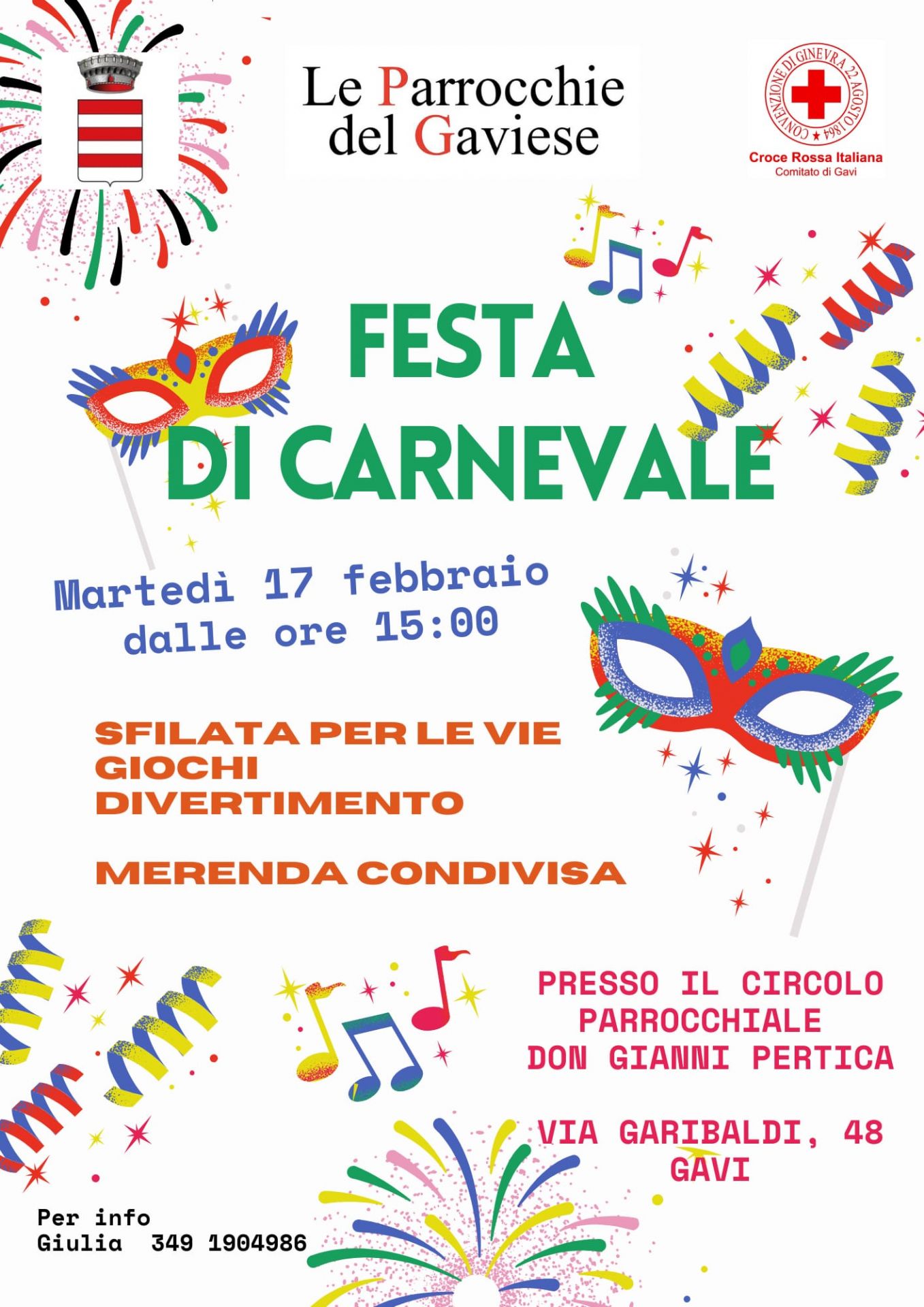 La Croce Rossa di Gavi organizza, presso il circolo parrocchiale Don Gianni Pertica, in via Garibaldi 48, la Festa di Carnevale: sfilata per le vie, tanti giochi e divertimento, e una merenda condivisa.