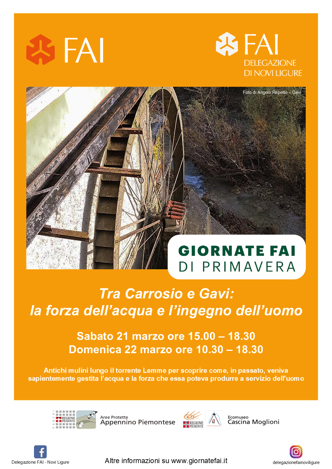 Sabato 21 marzo, dalle 15:00 alle 18:30, e domenica 22 marzo, dalle 10:30 alle 18:30, i volontari del FAI racconteranno degli antichi mulini presenti lungo il torrente Lemme.