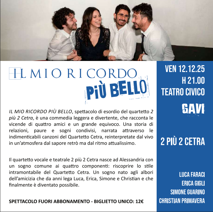 Fuori cartellone, "Il mio ricordo più bello", venerdì 12 dicembre alle ore 21 presso il Teatro Civico di Gavi.