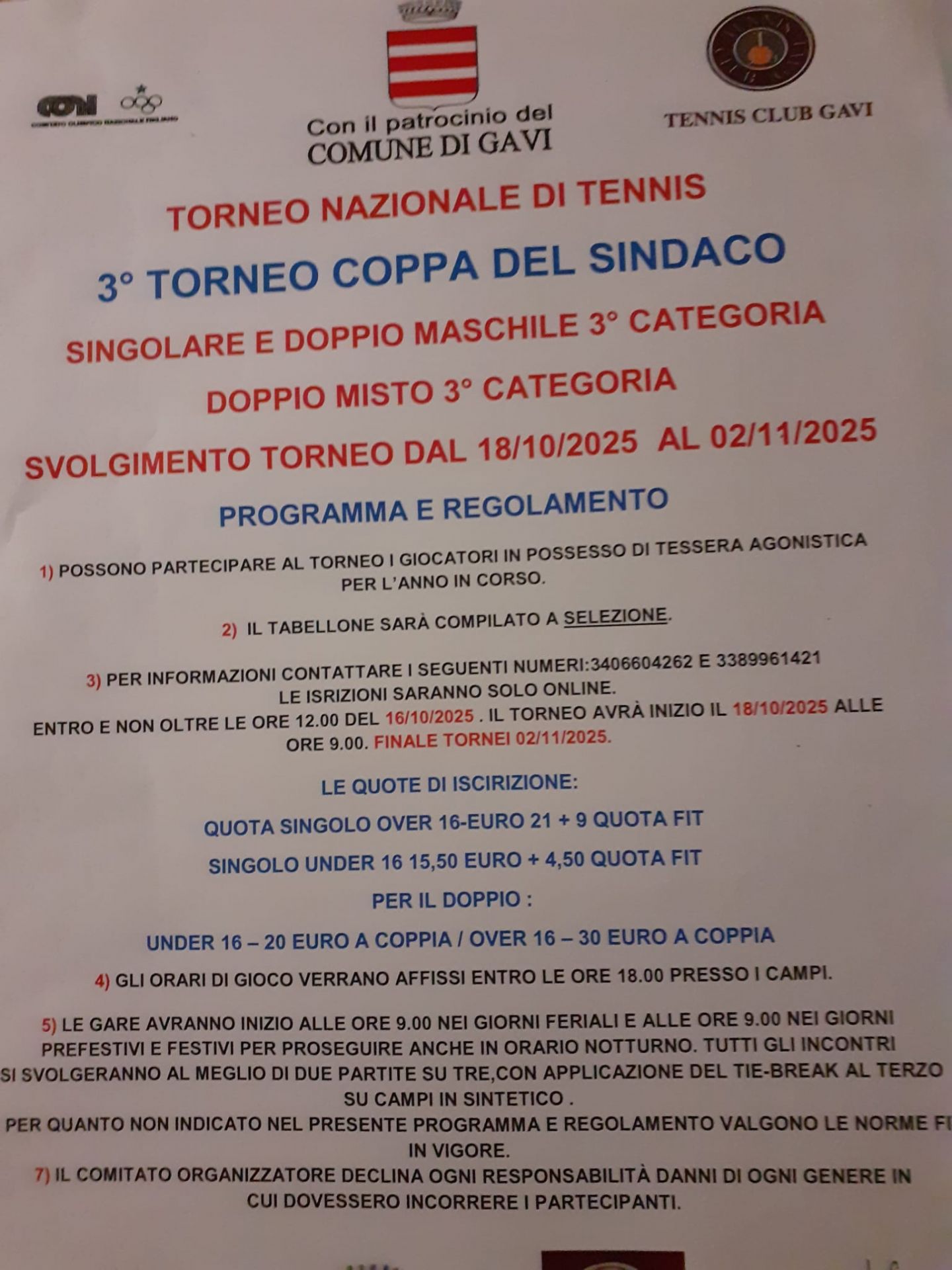Il Tennis Club Gavi Carlo Bassano, dall'18 ottobre al 2 novembre, organizza il 3° torneo coppa Sindaco, con singolari e doppi maschili, singolari femminili di terza categoria.