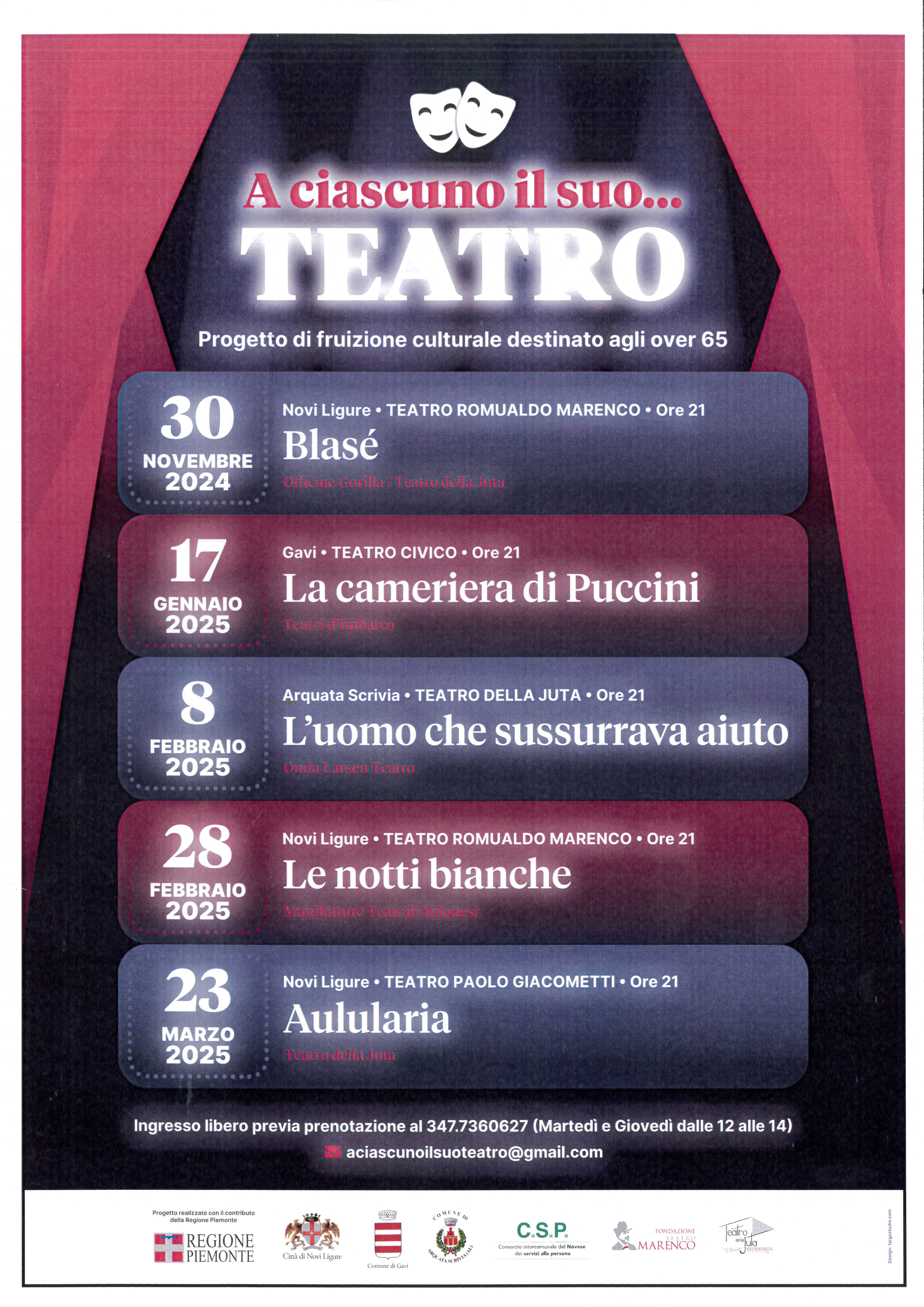 Il Comune di Gavi partecipa - in collaborazione con la Regione Piemonte, la città di Novi Ligure, il Comune di Arquata Scrivia, il C.S.P., la Fondazione Teatro Marenco e il Teatro della Juta - ad "A ciascuno il suo... teatro", progetto di fruizione culturale destinato agli over 65. Il programma prevede l'ingresso libero a cinque spettacoli teatrali (nell'allegato i titoli, i luoghi e le date delle rappresentazioni) previa prenotazione al 347.7360627 (martedì e giovedì dalle 12 alle 14).
