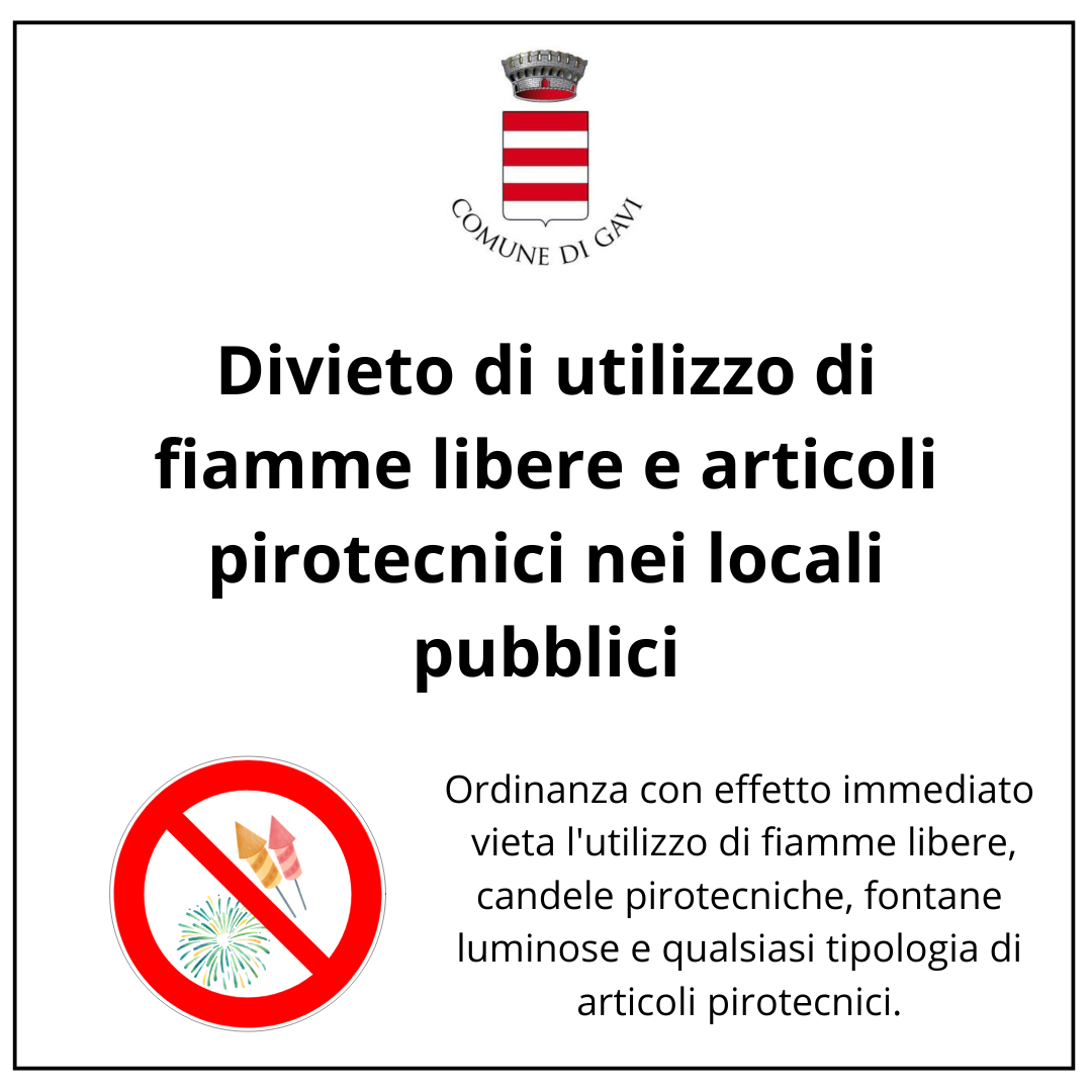 Si allega l'ordinanza relativa che con effetto immediato, ai fini della tutela dell'incolumità delle persone, nonché a tutela del patrimonio pubblico o privato, e valente su tutto il territorio comunale, in particolare nei locali pubblici, vieta l'utilizzo di fiamme libere, candele pirotecniche, fontane luminose e qualsiasi tipologia di articoli pirotecnici.