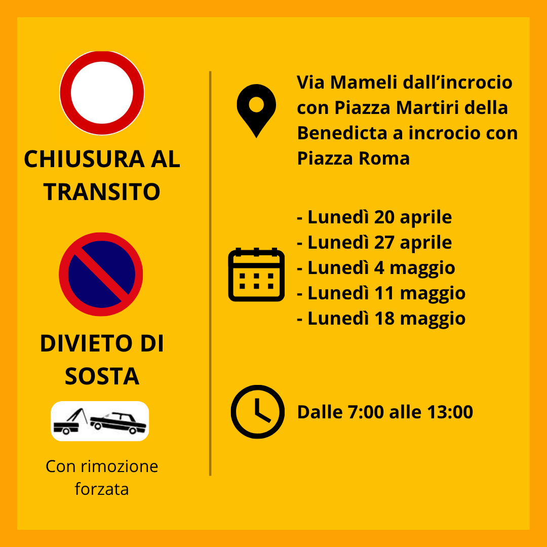 Vista la richiesta pervenuta dallo Studio AB S.r.l. per conto dell'Impresa Edile Gualco Andrea, si dispone la chiusura al transito e divieto di sosta con rimozione forzata di Via Mameli, dall'incrocio con Piazza Martiri della Benedicta all'incrocio con Piazza Roma, dalle 7:00 alle 13:00, nei seguenti giorni: