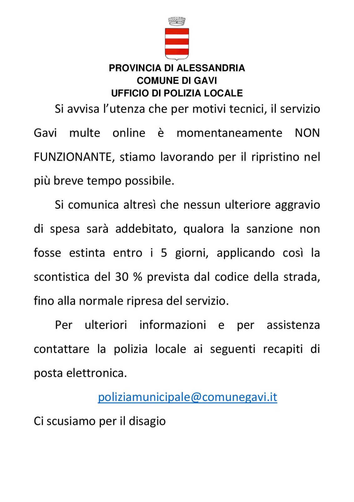 Per motivi tecnici il servizio Gavi Multe Online non è momentaneamente funzionante.