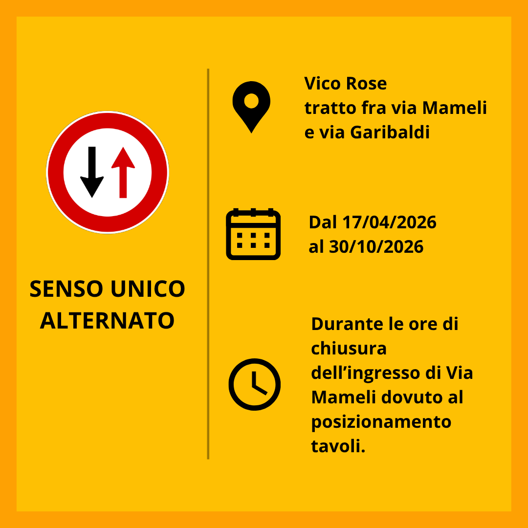 Vista l'autorizzazione all'occupazione di suolo pubblico per posizionamento di tavoli nella parte esterna del ristorante presente in loco, si dispone l'istituzione del senso unico alternato di Vico Rose nel tratto compreso fra via Mameli e via Garibaldi, dal 17/04/2026 al 30/10/2026, durante le ore di chiusura dell'ingresso da Via Mameli dovuto al posizionamento tavoli.