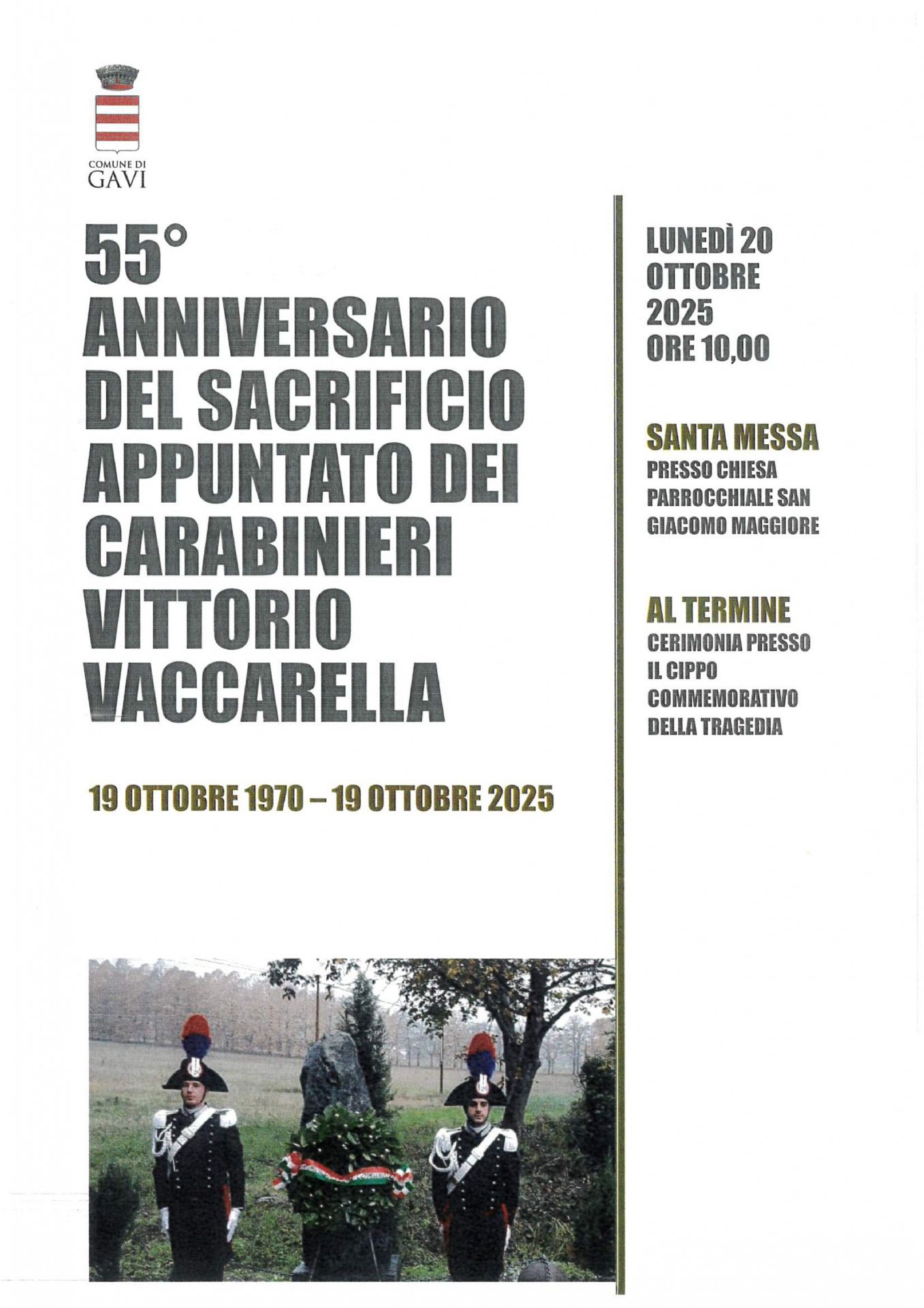 In occasione del 55° anniversario del sacrificio dell'appuntato dei Carabinieri Vittorio Vaccarella, lunedì 20 ottobre alle ore 10 si terrà la Santa Messa presso la Chiesa Parrocchiale di San Giacomo Maggiore.