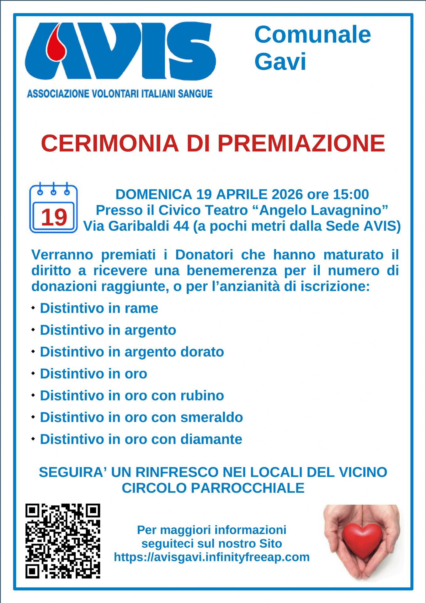 L'Associazione Volontari Italiani Sangue della sezione di Gavi premierà i Donatori che hanno maturato il diritto a ricevere una benemerenza per il numero di donazioni raggiunte, o per anzianità di iscrizione.