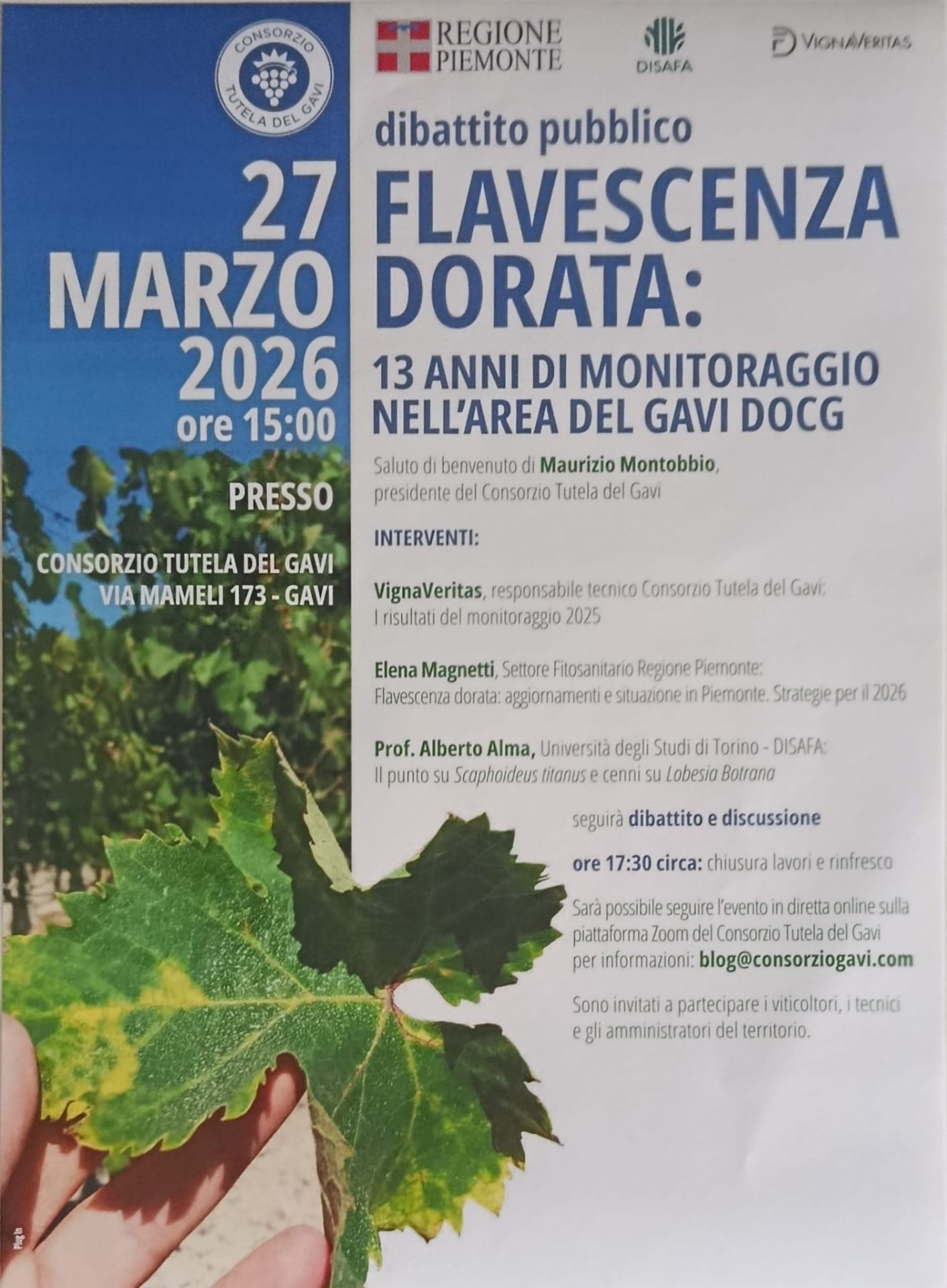 Il Consorzio Tutela del Gavi organizza per venerdì 27 marzo alle ore 15:00 un dibattito pubblico sulla Flavescenza Dorata - 13 anni di monitoraggio nell'area del Gavi DOCG.