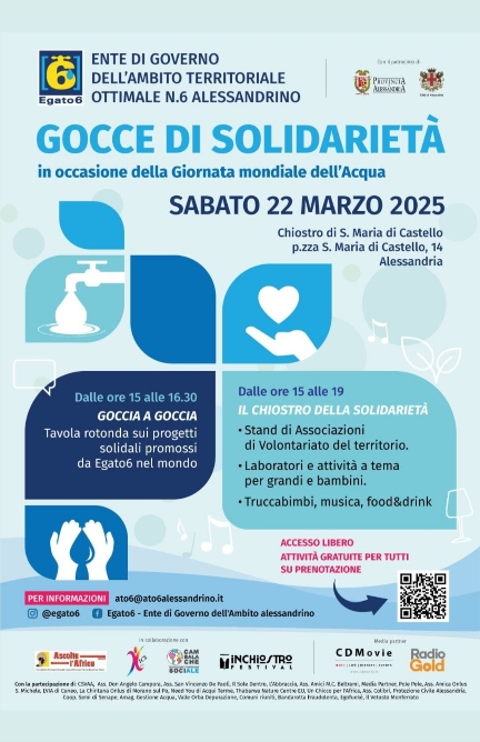L'Associazione Amici di Luca Onlus, in occasione della Giornata mondiale dell'Acqua del 22 marzo, organizza in tale data l'evento Gocce di solidarietà, presso il Chiostro di S. Maria di Castello in piazza S. Maria di Castello 14, ad Alessandria.