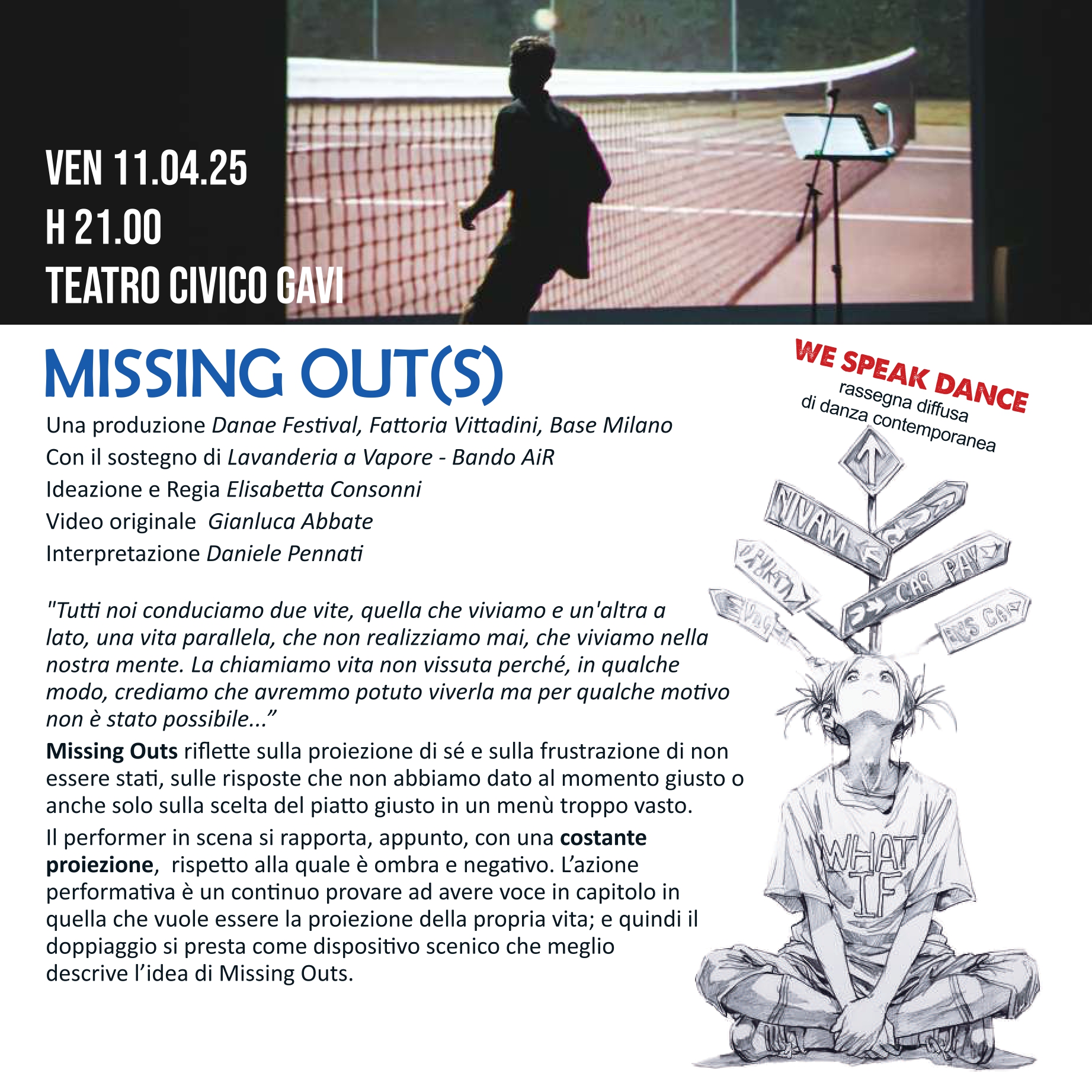 Venerdì 11 aprile alle ore 21, presso il Teatro Civico di Gavi, vi sarà lo spettacolo Missing Out(s), facente parte della stagione teatrale 2024 - 2025 Non è Pirandello.